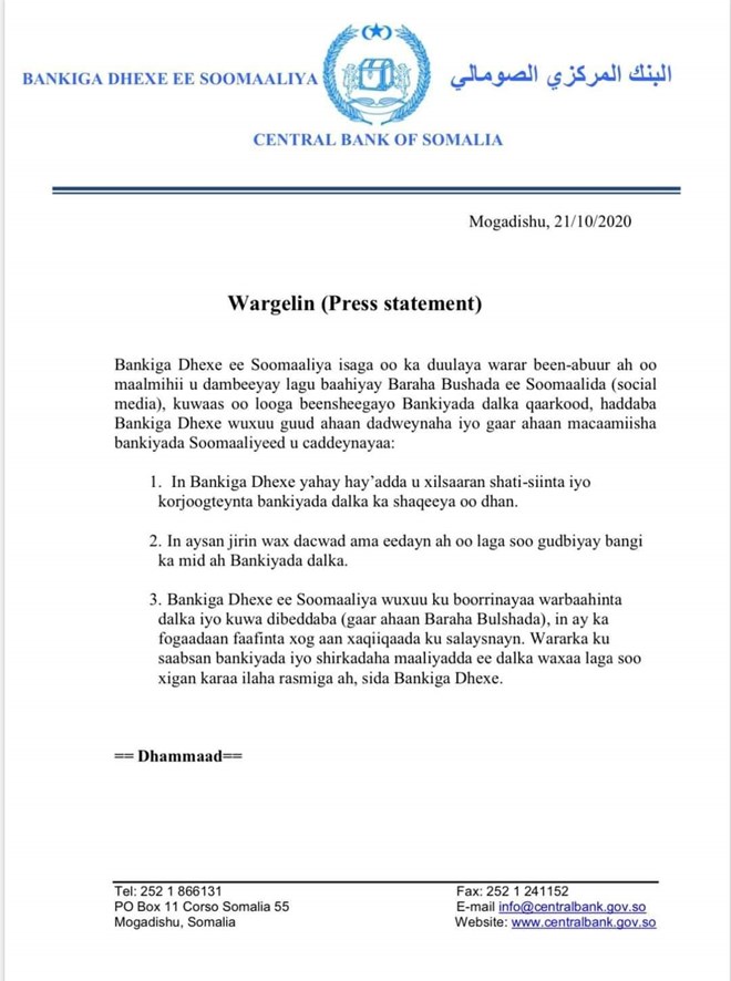 Harrgeysa(BGM):- Bankiga dhexe ee Soomaaliya ayaa soo saaray warsaxaafadeed uu ku beeninayo jiritaanka in dacwad laga gudbiyay bankiyada gaarka loo leeyahay ee kuyaala Soomaaliya.