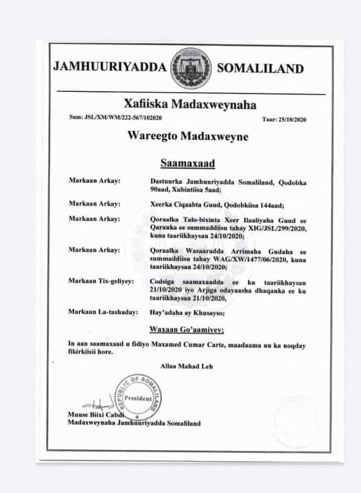 Qoraalka ka soo baxay xafiiska Madaxweyne Biixi ee lagu saamaxay Maxamed Cumar Carte