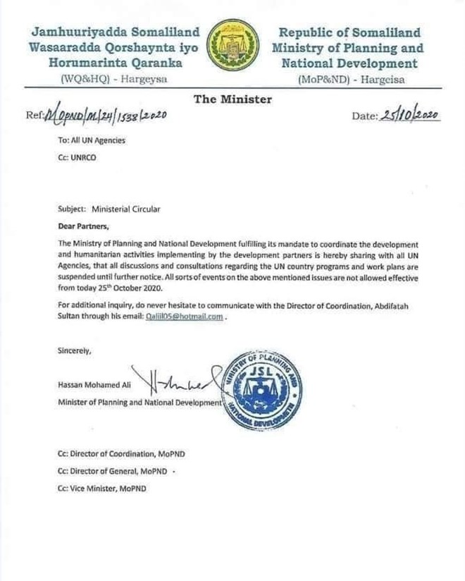 Wasaaradda Qorshaynta & Horumarinta Somaliland, ayaa soo saartay bayaan ay ku shaacisay inay hakisay wada shaqeyntii ka dhaxeysay UN-ka iyo Somaliland.