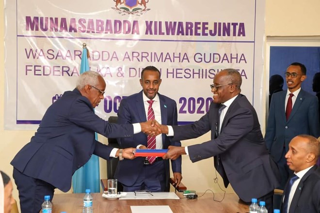 Hargeysa(BGM):- Ra’iisal Wasaaraha Xukuumadda Soomaaliya Maxamed Xusseen Rooble ayaa xilalka u kala wareejiyay Wasiirka cusub ee Wasaarradda Arrimaha Gudaha, Federaalka iyo Dib-u-heshiisiinta Gen Mukhtaar Xusseen Afrax iyo Wasiirkii hore ee Wasaarradda Cabdi Maxamed Sabriye.