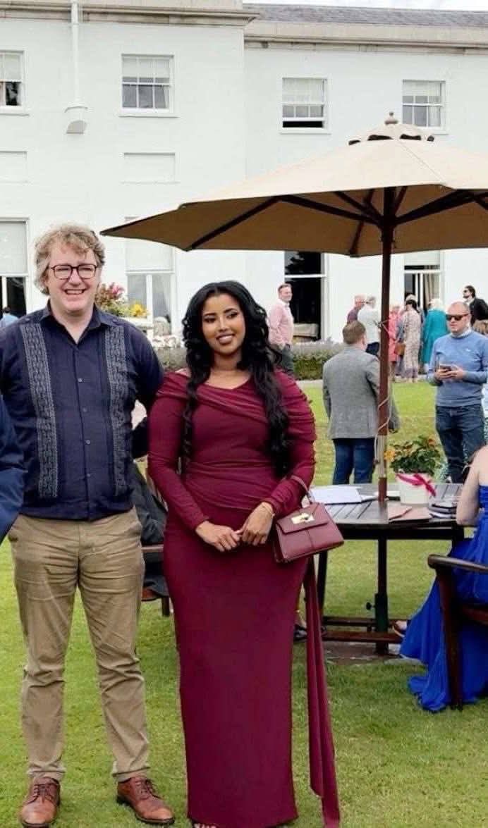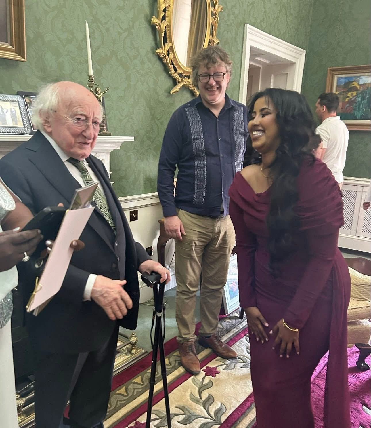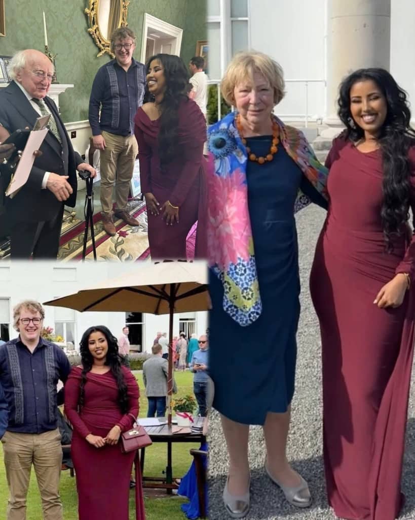 Ireland(Hayaannews): Fanaanada da’ada yar ee reer Somaliland Najma Abdinasir Iise Kahin (Najma Nashaad) oo muddooyinkii u danbeeyey degenayd dalka Ireland ayaa  kulan sharafeed la qaadatay maanta madaxweynaha dalka Ireland  Michael D. Higgins iyo xaskiisa Sabina Coyne Higgins.kadib markii lagu casuumay qasriga madaxtooyada dalkaas.